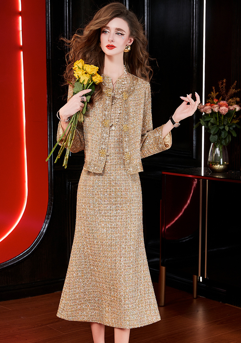 Product Name 产品名称: Autumn Noble Lady Style Pearl-Embellished Sleeveless Dress with Chinese Frog Button Jacket Set