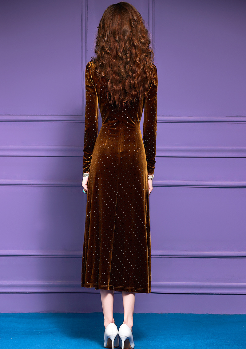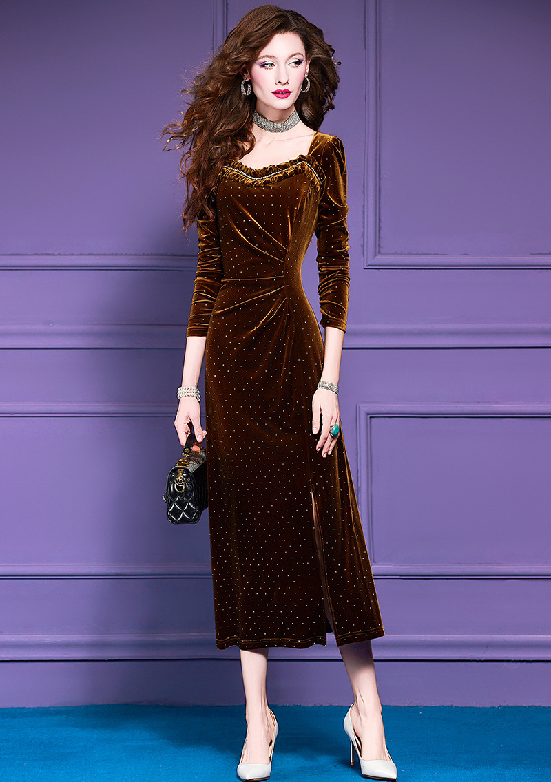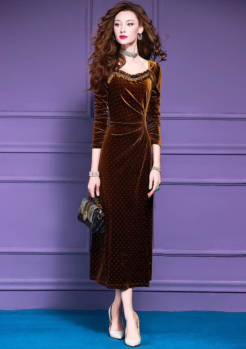 Product Name 产品名称: Beaded Velvet Dress Women's Autumn French Sophisticated High-Waist Pleated Square Neck Gown‌