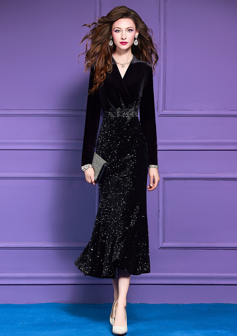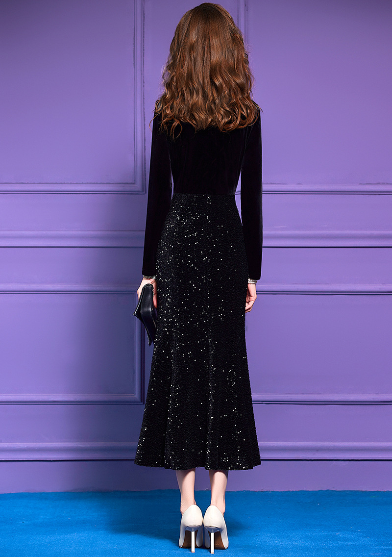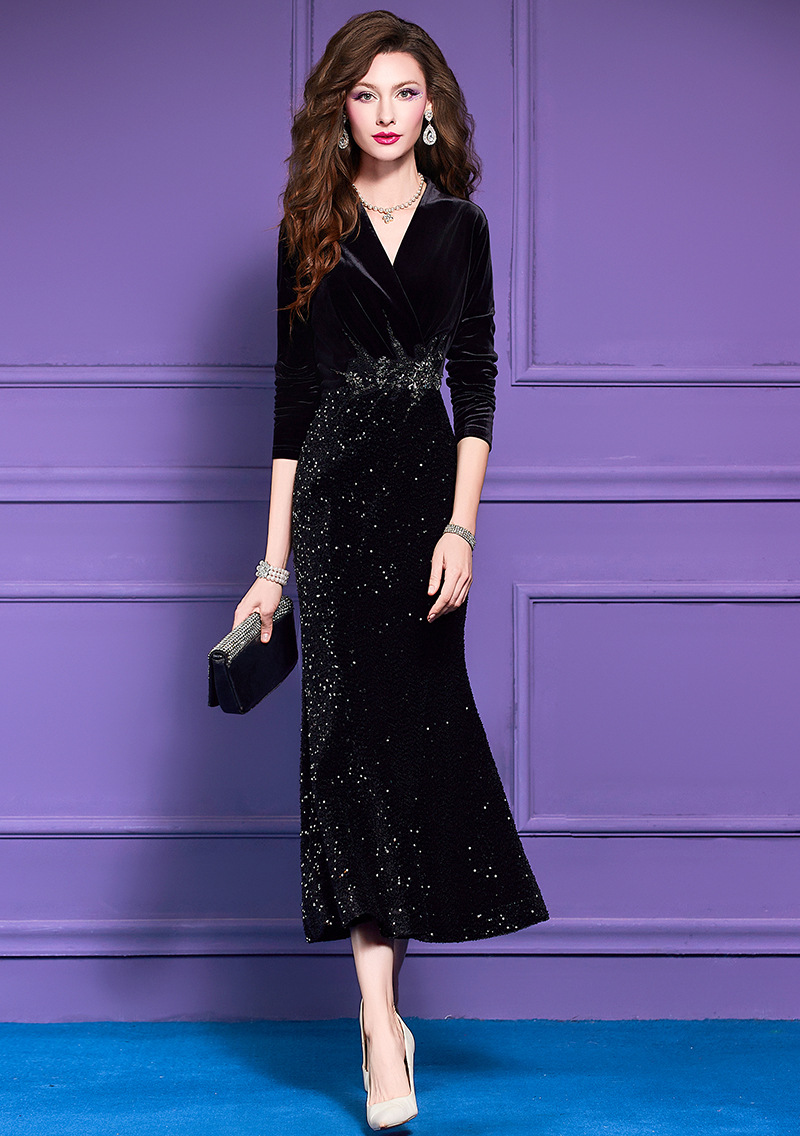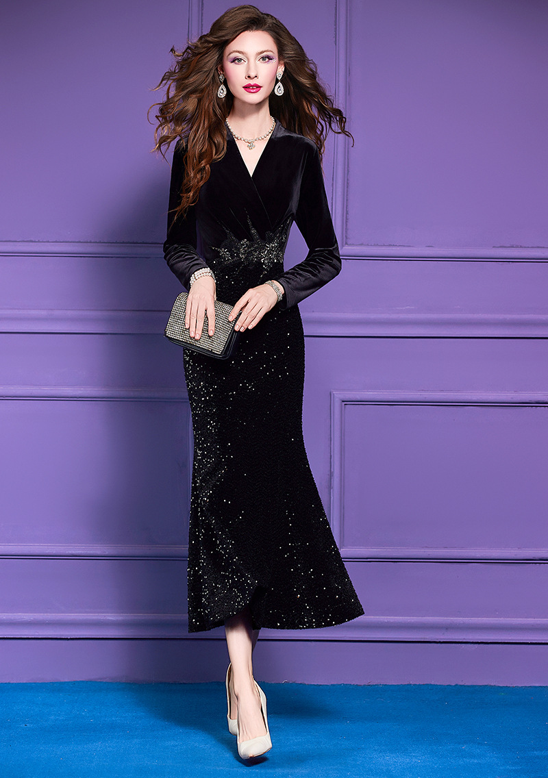 Product Name 产品名称: Beaded Velvet Dress for Women - Autumn French Sophisticated High-Waist Pleated Square Neck Gown