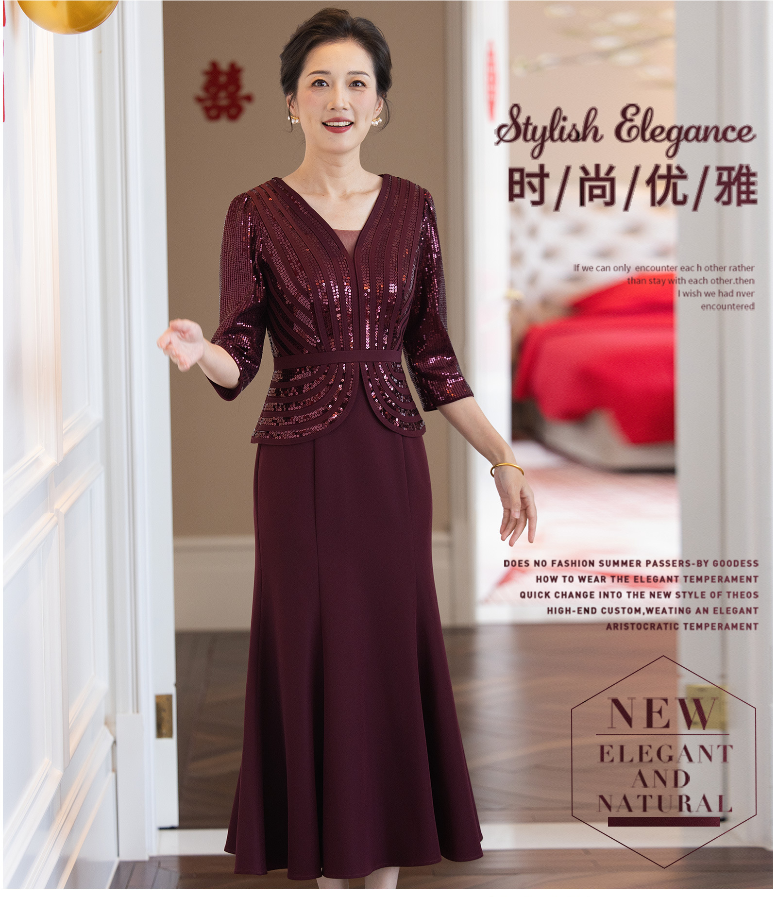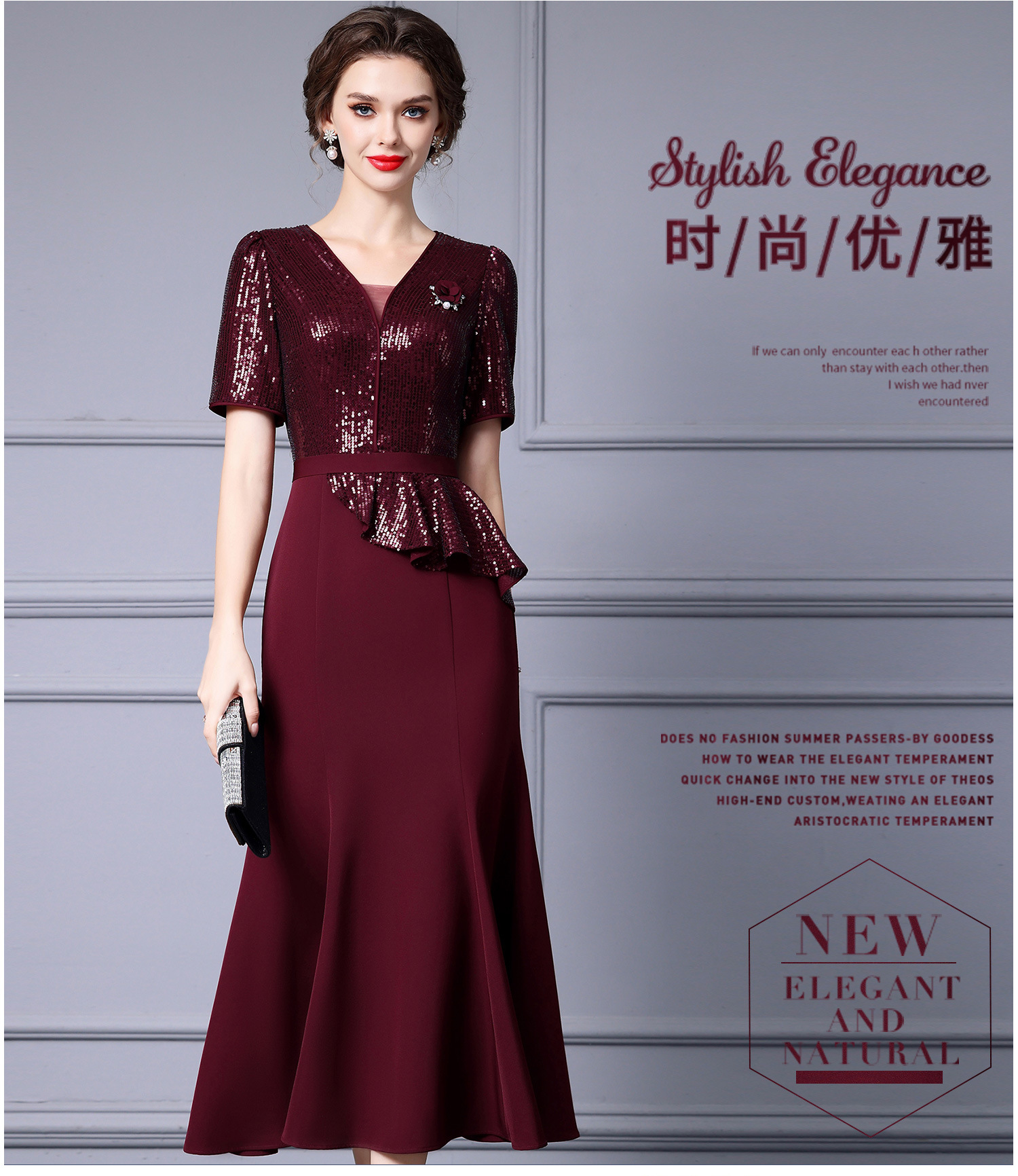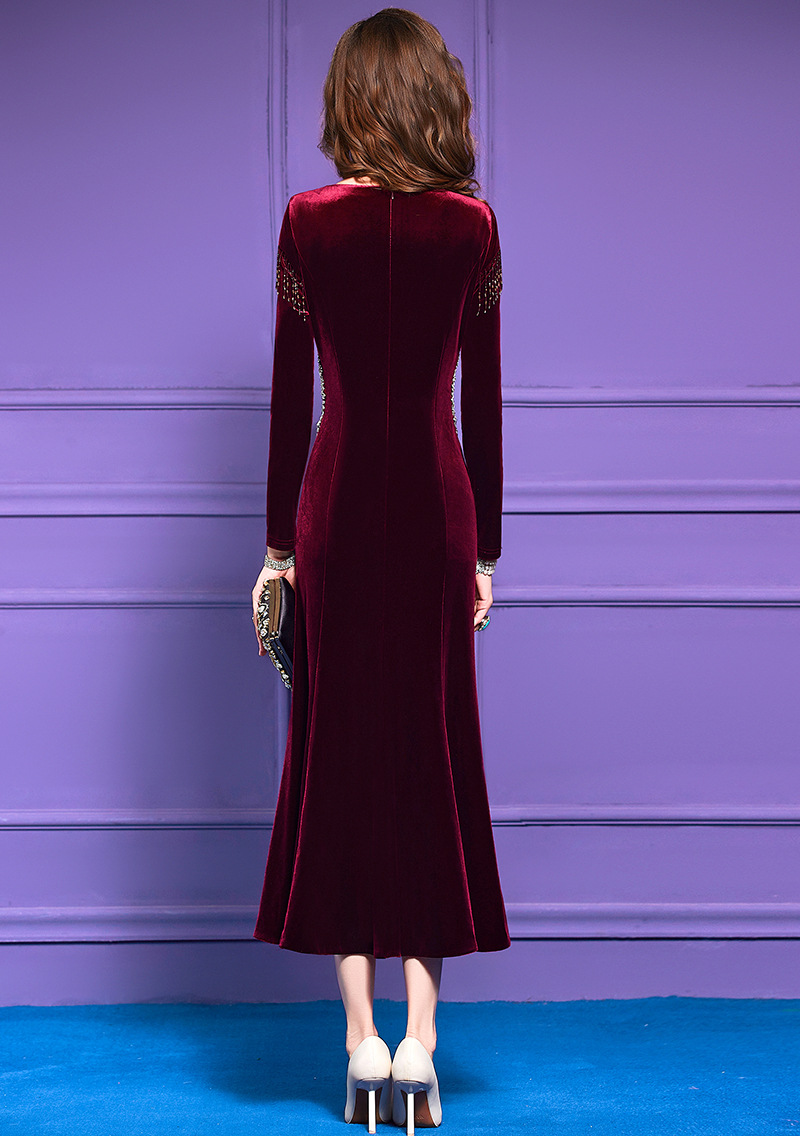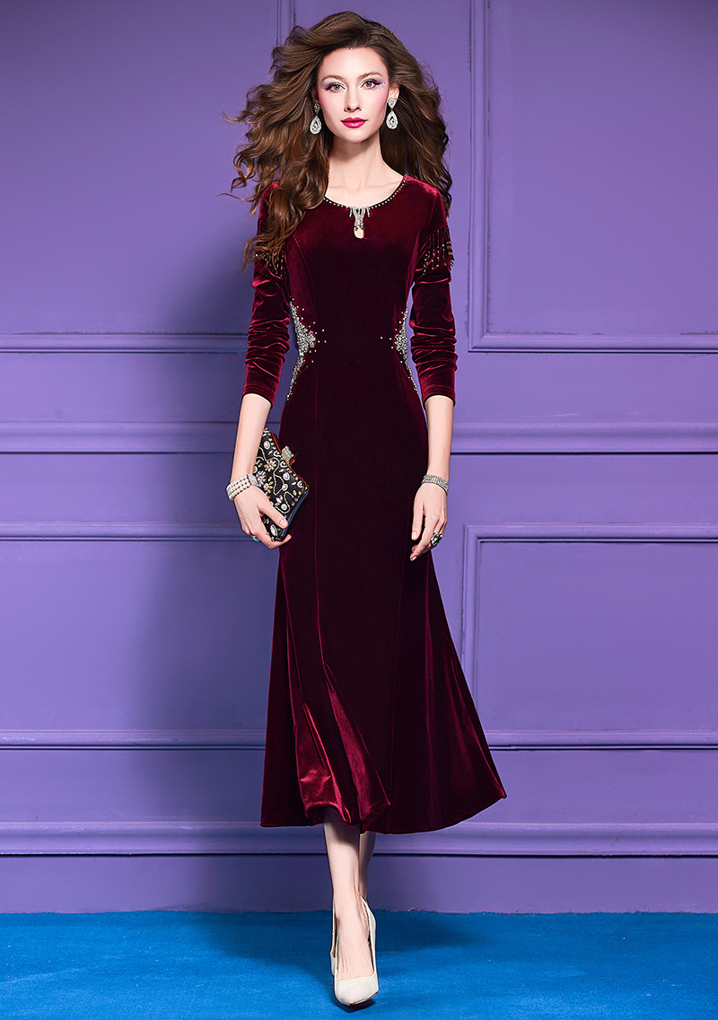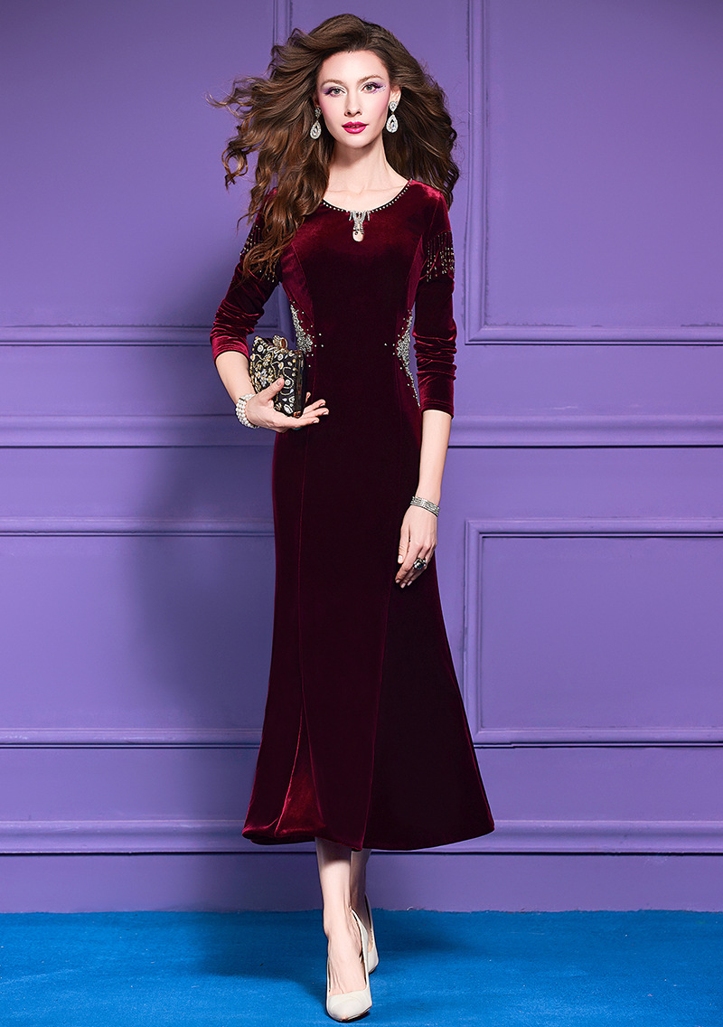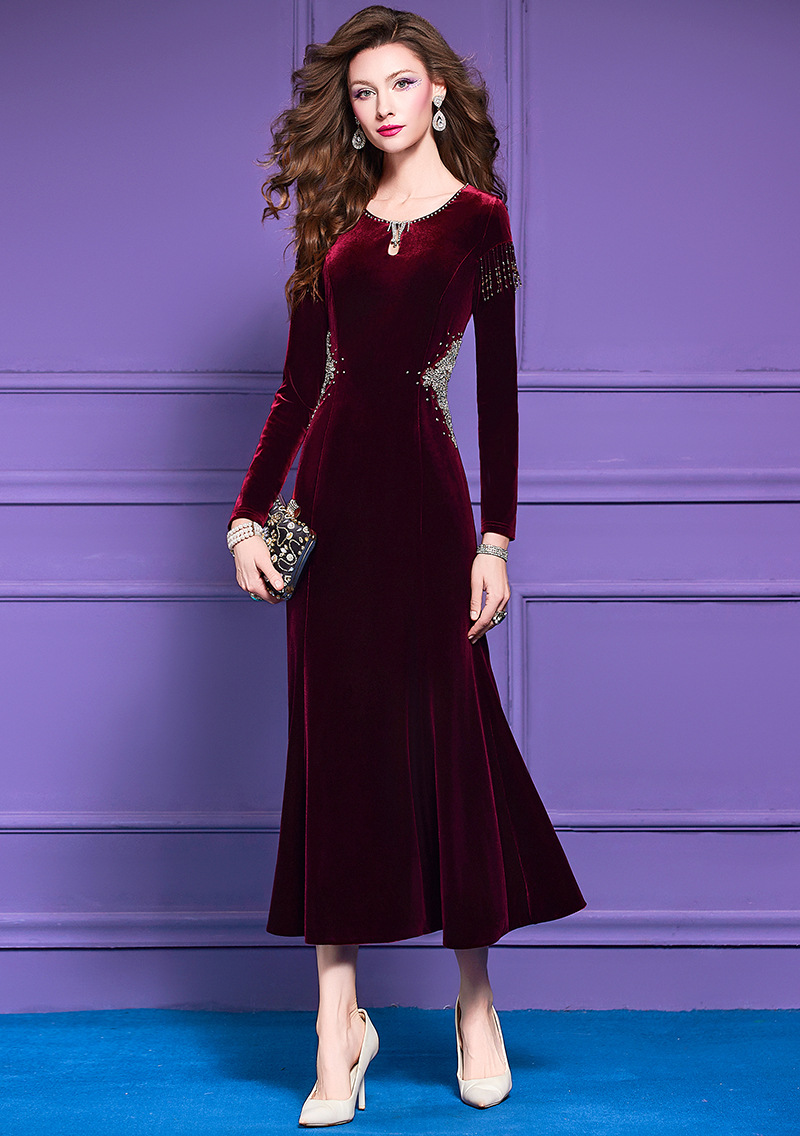 Product Name 产品名称: 钉珠红色连衣裙女Beaded Red Velvet Dress for Women - Autumn New Retro High-End Waist-Tie-in Square Neck Gown‌