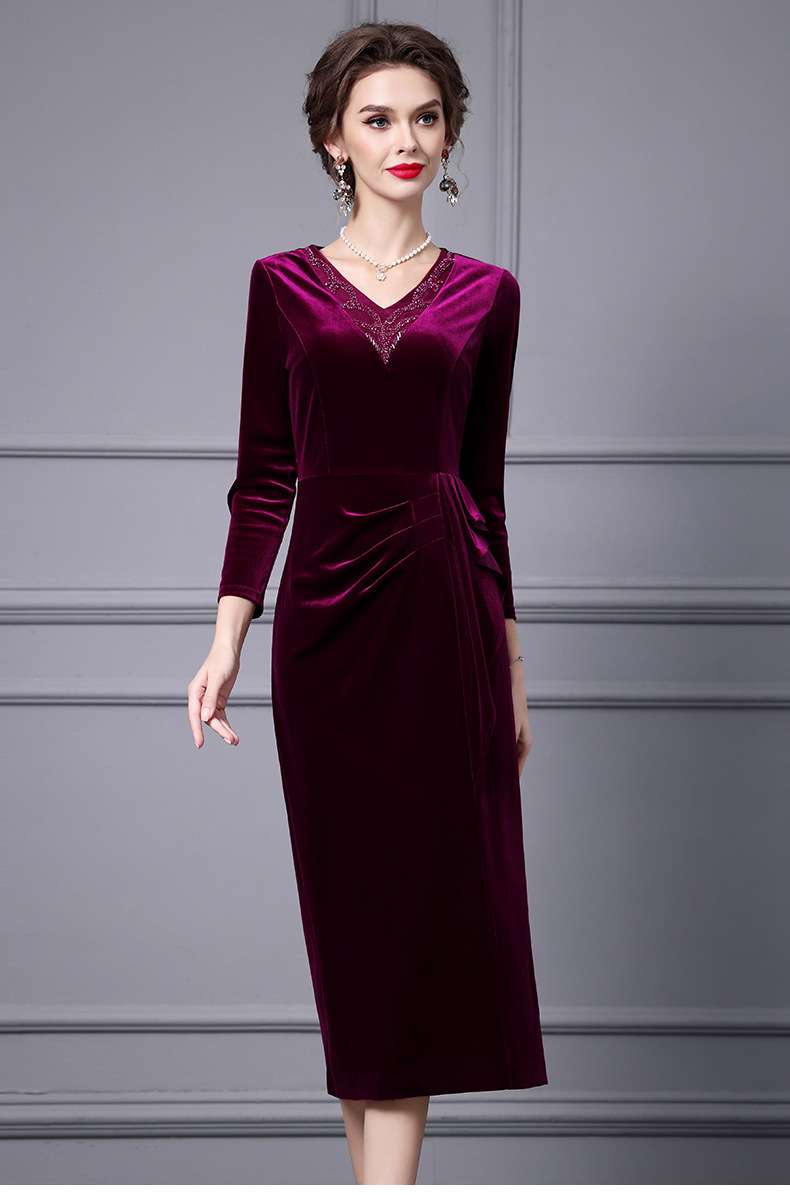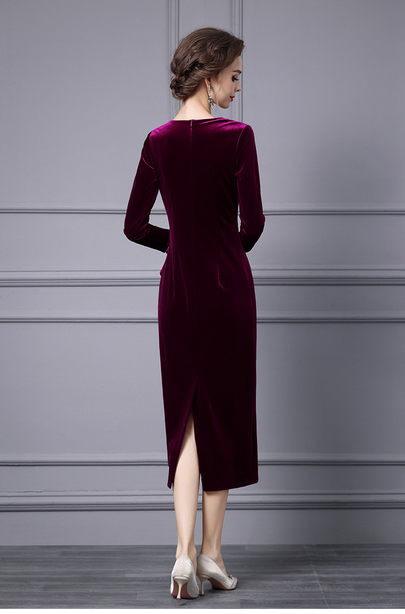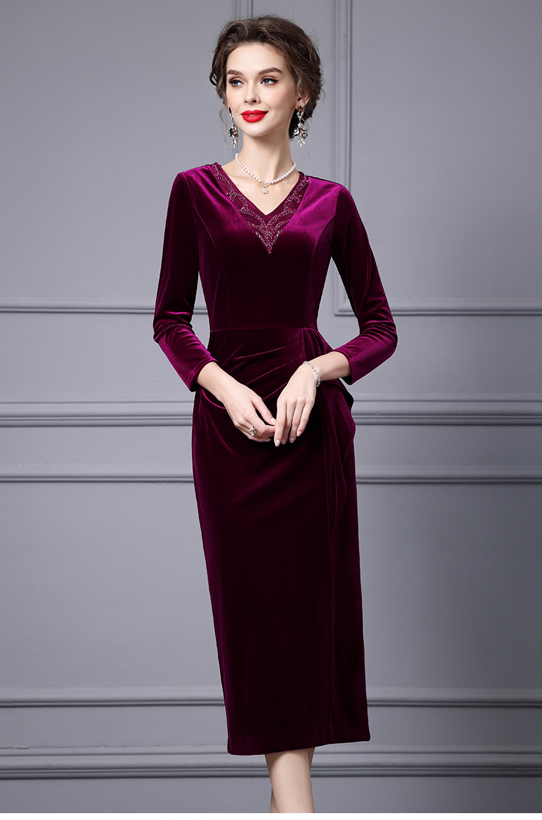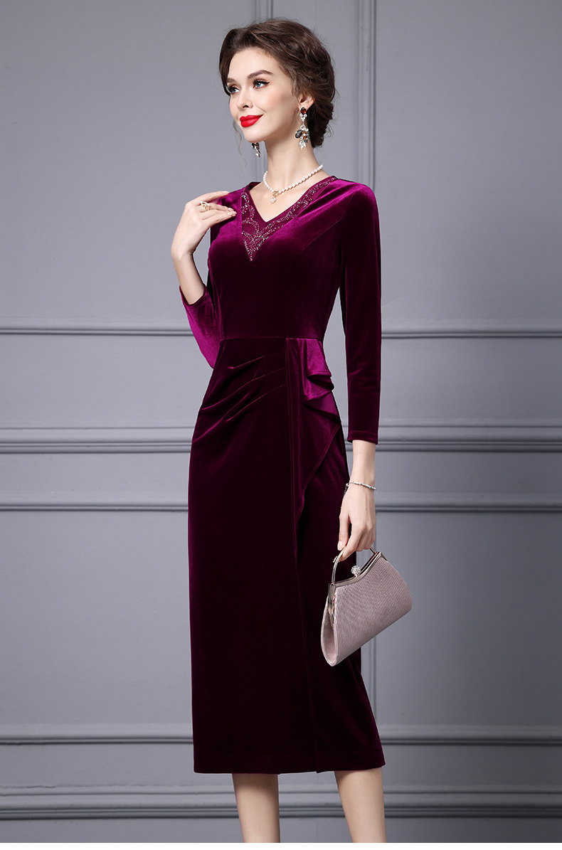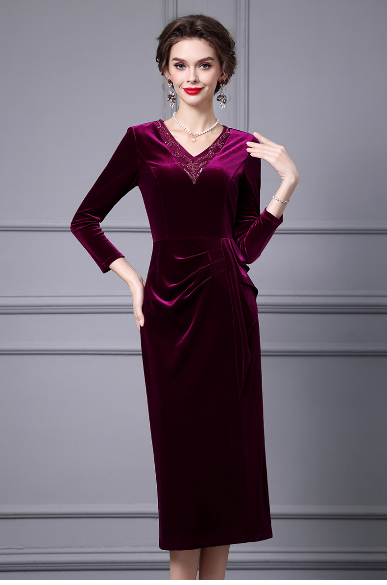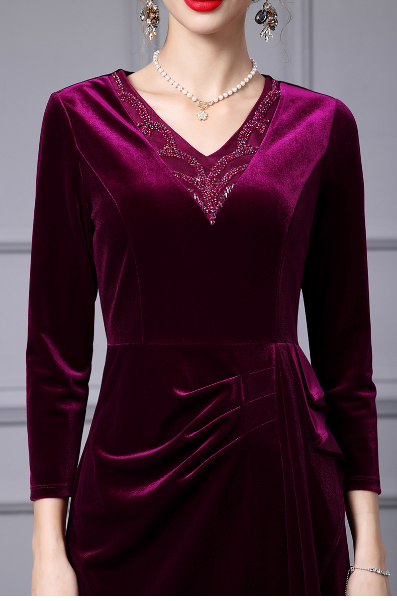 Product Name 产品名称: 2025 Autumn New Arrival: Mature & Elegant Velvet Dress in Wine Red - High-Waisted Slimming Mid-Length Gown